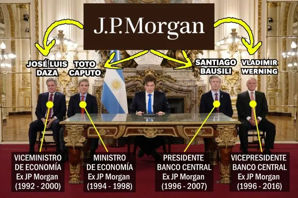 El gobierno de La Libertad Avanza se ha caracterizado por la fuerte presencia de ex-ejecutivos de JP Morgan en su estructura. Con la designación de Alejandro Leu como nuevo secretario de Finanzas, ya son siete los ex JP Morgan que integran el gabinete: Luis Caputo (Ministro de Economía), Santiago Bausili (Presidente del Banco Central), Pablo Quirno (Canciller), Vladimir Werning (Vicepresidente del Banco Central), José Luis Daza (Viceministro de Economía), Demian Reidel (Estratega de IA y temas nucleares) y el propio Leu. La influencia de Jamie Dimon, CEO de JP Morgan, resulta visible: su visita a Buenos Aires, poco antes de las elecciones, incluyó encuentros con Milei y otros banqueros y empresarios, en un gesto interpretado como una señal de alineamiento político y financiero.